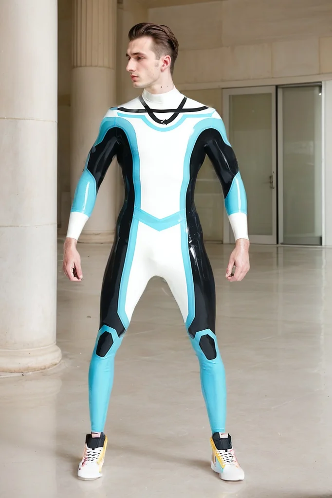 Material and Design: This catsuit is a dynamic and futuristic piece crafted from high-gloss genuine latex. The design features a compelling Pure White body with vibrant Light Blue panels on the arms and legs. The sides of the body and the inner arms are a sleek Black, creating a powerful and high-tech look. A black V-shaped pattern at the collar adds an extra layer of visual complexity. The glossy, reflective material perfectly conforms to the body, emphasizing the wearer's physique and muscle definition.